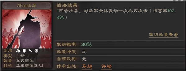 可拆战法【主动战法】所向披靡:1回合准备,对敌军全体造成兵刃伤害。