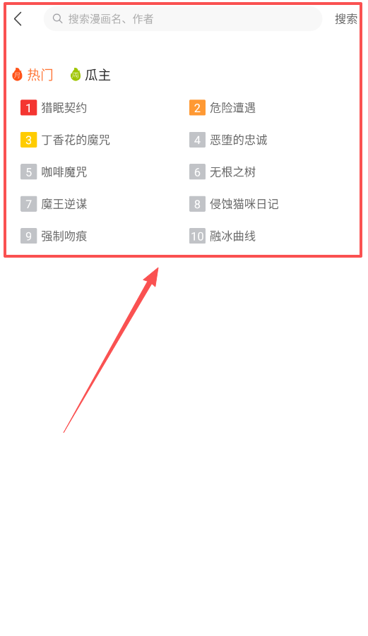 3、想找某本特定的漫画吗,点一下顶部的搜索键,输入名字或者作者,或者直接点下面现成的热门词。