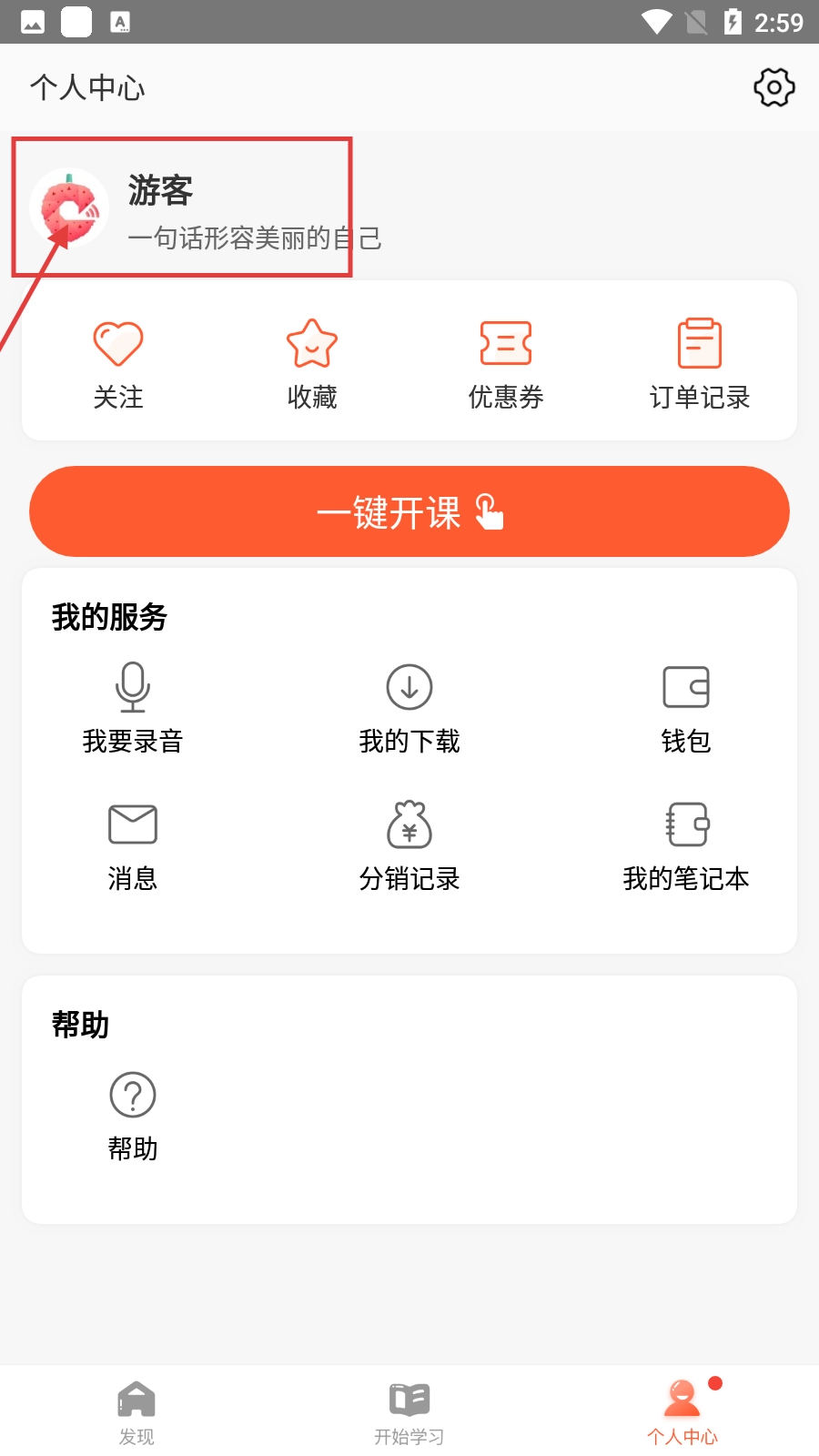 2、在【个人中心】页面,点击【游客】区域可进入登录流程,以便使用关注、收藏等功能。
