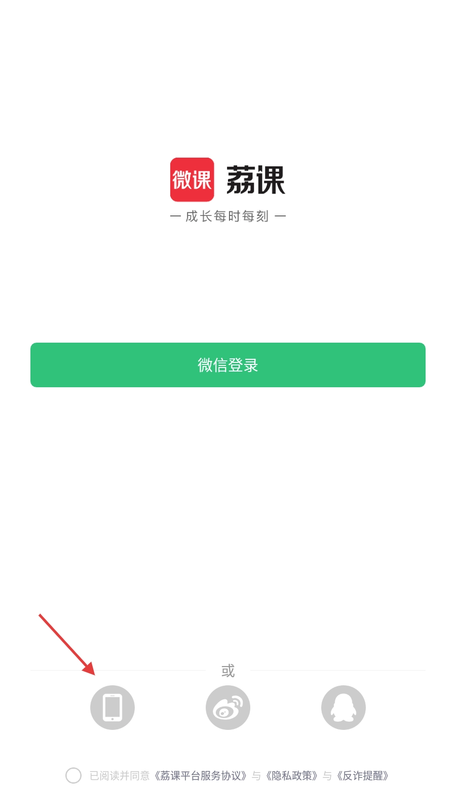 3、在登录页面,可选择微信登录、手机登录、微博登录或QQ登录,若选择手机登录,进入相应登录流程。