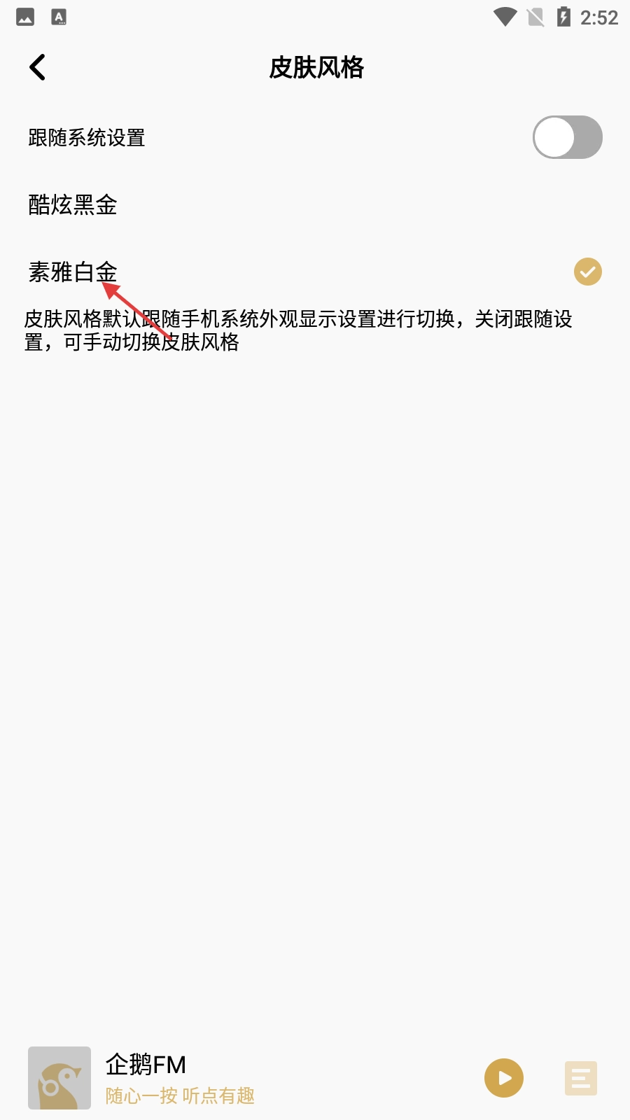 3、在【皮肤风格】设置界面,可看到有【跟随系统设置】【酷炫黑金】【素雅白金】三种选择,默认可跟随系统或手动选择风格。