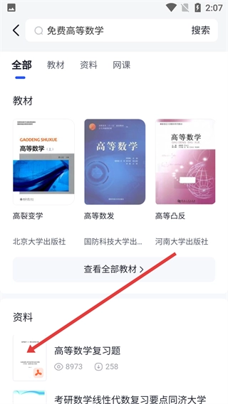 3、搜索后在结果中,找到如【高等数学复习题-资料】,点击进入其【资料详情-页面】。
