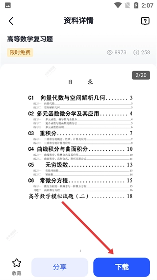 4、在【资料详情-页】,查看如【高等数学复习题-目录】后,点击【-按钮】即可获取该资料。