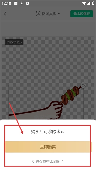 3、弹出保存选项后,可选择【立即购买】解锁无水印保存,或选【免费保存带水印图片】获取素材呀。
