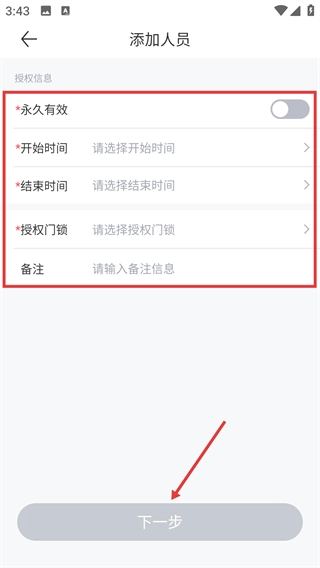 4、在【添加人员】页填写授权时间、授权门锁等必填信息,完成后点击【下一步】提交配置。