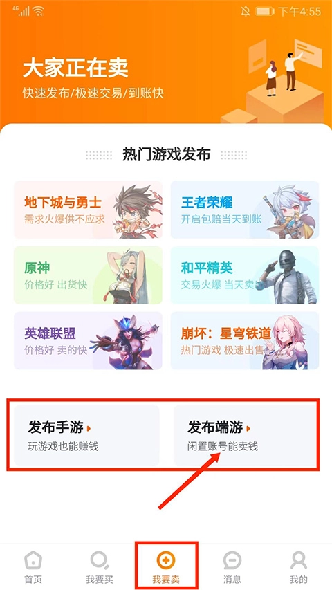 1、打开7881交易平台,在首页下方的导航栏中点击“我要卖”,接着选择发布端游账号信息,此处以【发布端游】为例进行说明。