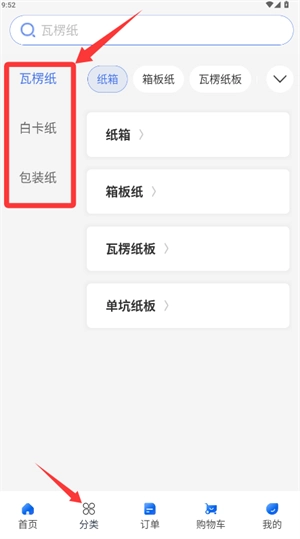 2、从首页底栏进入分类界面,在左侧挑选所需纸品类。