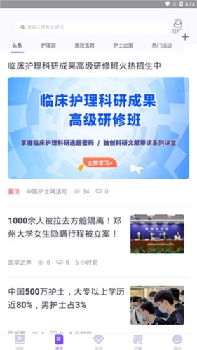 2、切换到【资讯】页面之后,我们还能看到非常多的新闻资讯内容,如头条、护理部、医院直聘等。