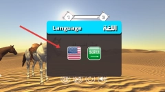 1、在语言选择界面,点击美国国旗图标,将游戏语言设为英语,随后进入沙漠场景的游戏主界面,准备开启骑马挑战。