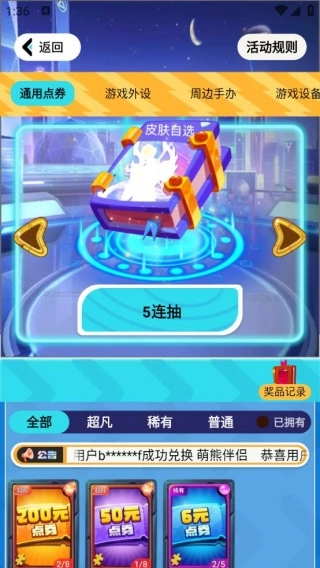 2、进入到平台福利界面,有皮肤自选,手办周边,游戏外设,游戏设备等分类。