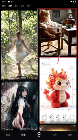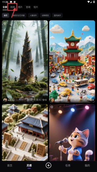 2、在灵感页面,点击顶部视频标签,筛选视频类灵感内容。