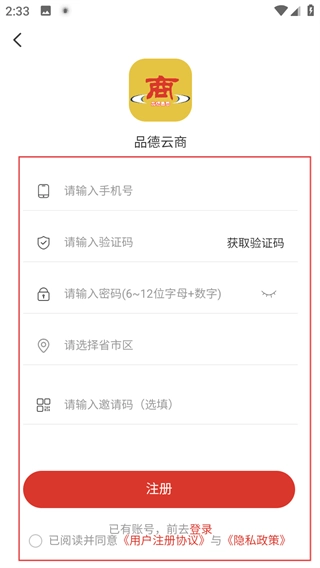 4、在注册页面,填写相关信息后,点击注册,完成账号注册。