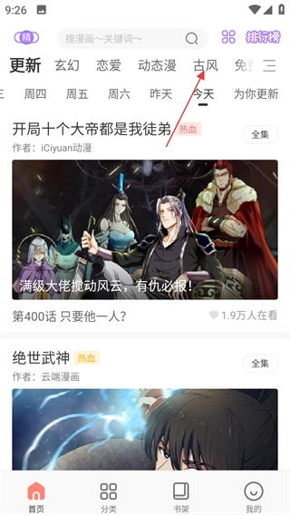 1、打开软件首页后,点击顶部的古风标签,即可进入古风漫画分类页面。