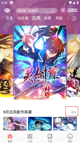 2、在古风漫画分类页面,点击更多,进入古风新作列表页面。