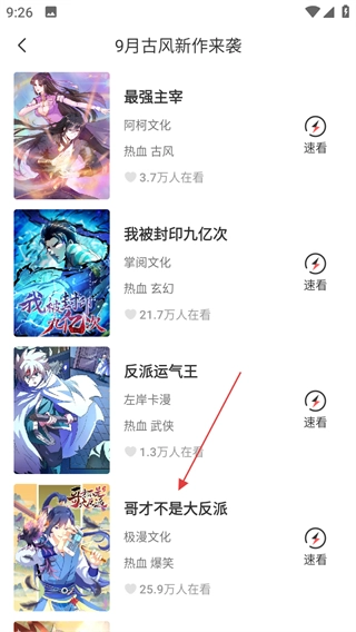 3、在古风新作列表页面,找到哥才不是大反派,点击进入其详情页面。