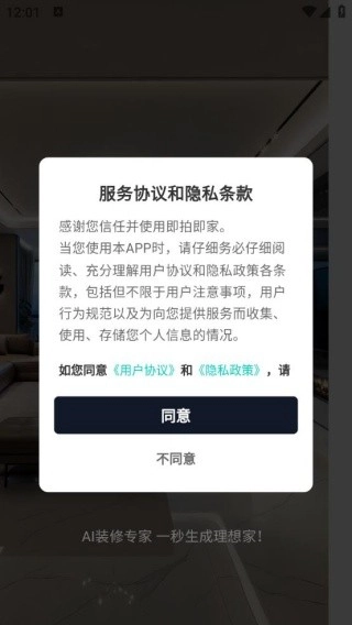 1、软件安装完成后打开,会弹出服务协议与隐私条款,点击同意即可。