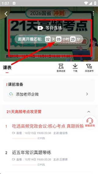 4、领取课程后,可查看课程直播倒计时等信息,等待直播开始。
