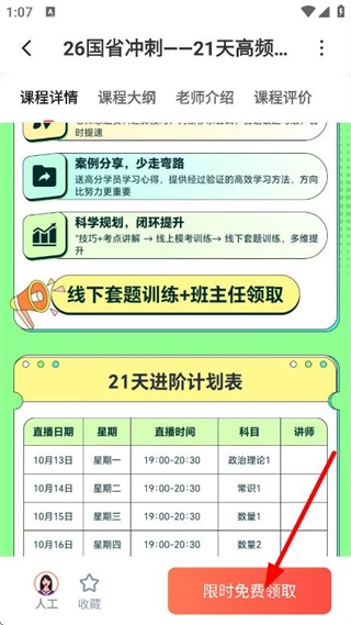 3、在课程详情页,点击限时免费领取,领取该课程。