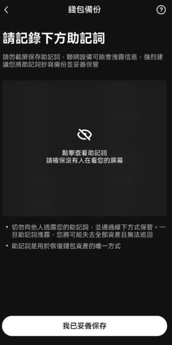 当然已经建好了,但需要另外备份才看得到,所以接下来要做的就是备份钱包抄写注记词,不然假设哪天你登入该钱包的手机或电脑不幸遗失,你将会无法使用你的钱包,但有注记词的话就可以在其他钱包中导入注记词使用。