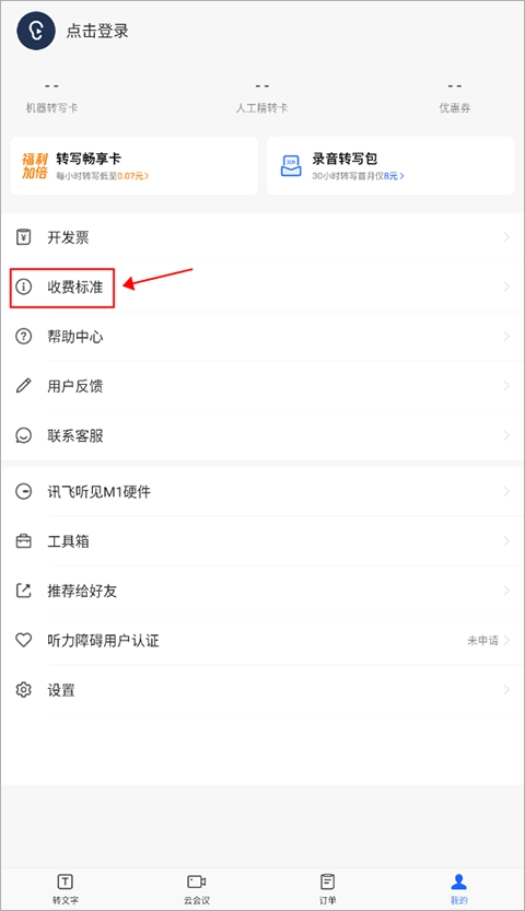 想要了解讯飞听见的收费标准的话,我们就需要进到个人中心界面,通过下方列表中的“收费标准”查看到非常详细的介绍。
