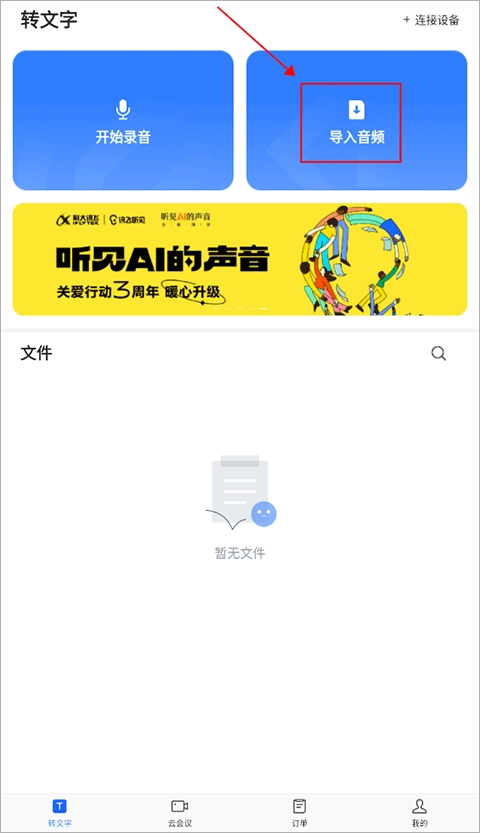 1、首先我们进入到讯飞听见主界面之中,在转文字界面中点击选择“导入音频”。