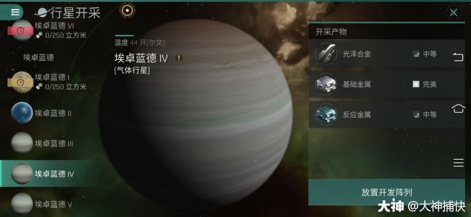具体操作十分简单,打开行星开采页面后,在左侧点击想要开采的行星,点击右下方的【放置开发阵列】,在想要开采的产物上拉满阵列数即可,如果想同时开采多种产物可以将阵列均匀分配,此数量可以随时随地在【开采设置】中进行调整。