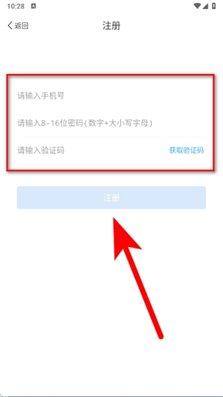 4、依次输入手机号,点击获取验证码并填写收到的验证码,点击注册按钮,完成账号注册。