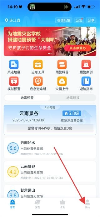 1、在地震预警的首页,点击页面底部的“我的”选项,即可进入个人相关页面。