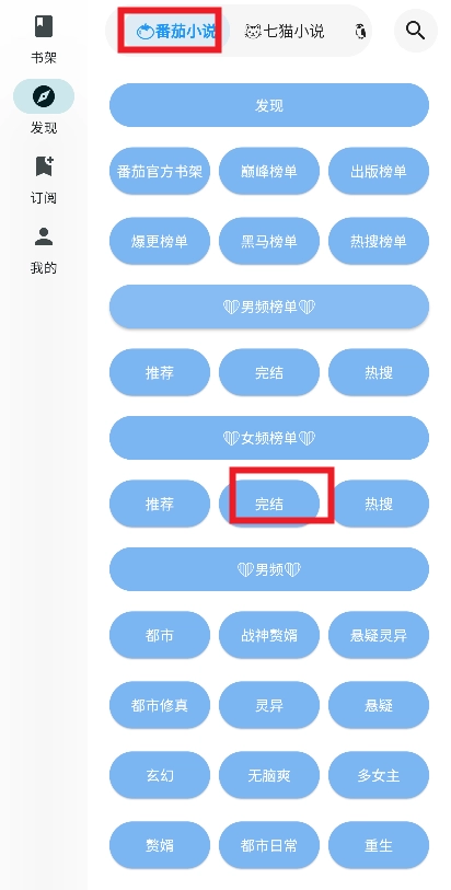 2、进入到页面后点击发现选择自己喜欢的小说平台,想看的小说类型