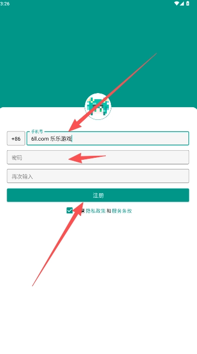 2、输入用户本人注册使用手机号码,填写密码并再次输入,点击注册。