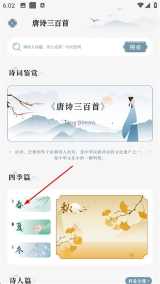 3、在唐诗三百首页面,点击春,进入春季唐诗页面。