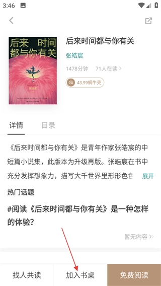 4、在后来时间都与你有关详情页面,点击加入书桌,将书籍加入书桌。