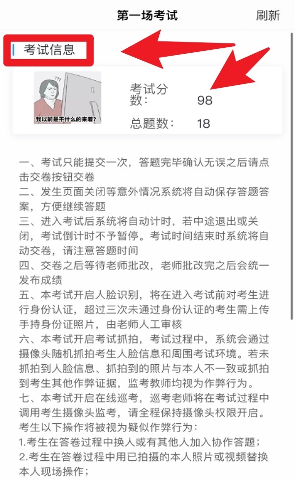 2. 进入考试页面后,可查看当前考试名称、总题数与得分情况,同时阅读系统关于考试流程与注意事项的说明。