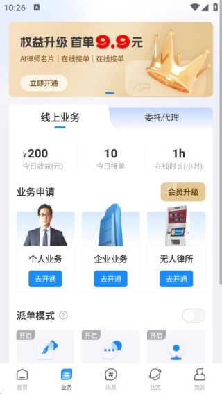 1、支持业务接单,查看预计收益、预计接单量与在线时长,还能进行个人、企业等业务申请。