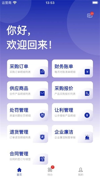 3. 在首页即可看到采购订单、财务账单、供应商品等功能;