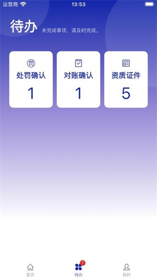 4. 点击页面下方的“待办”选项,就能看到处罚确认、对账确认、资质证件等相关功能。