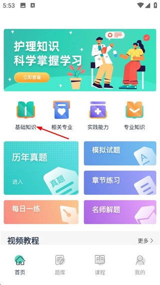 1、在医教无忧的首页,找到并点击“基础知识”选项,即可进入基础知识页面。