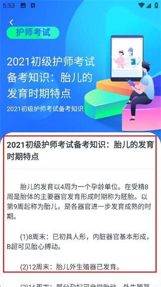 4、在内容详情页面,可查看2021初级护师考试备考知识胎儿的发育时期特点的具体内容。