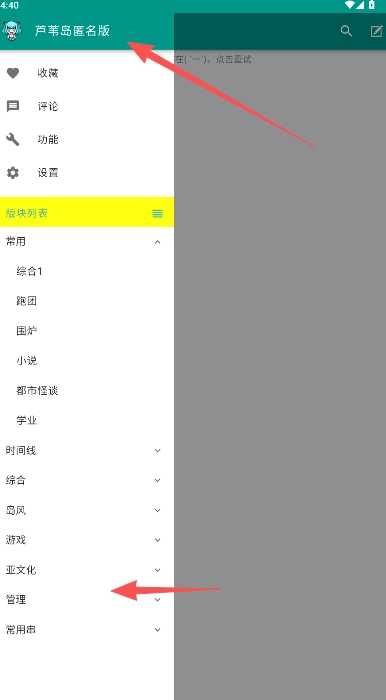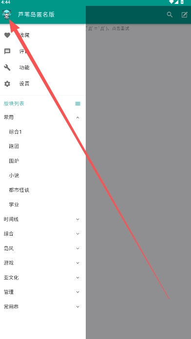 1、点击首页左侧列表,点击弹出的名称芦苇岛匿名版处。