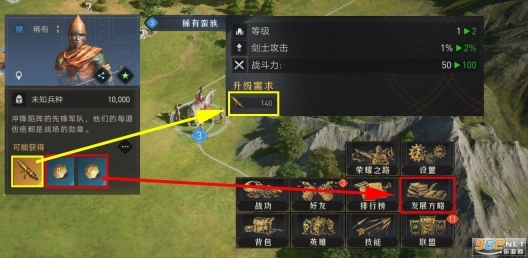 知识卷轴与发展方略的获取途径一致,大多源自普通及稀有蛮族士兵。需注意的是,稀有蛮族每日仅能击杀5次,大家记得每日都去攻打。