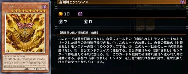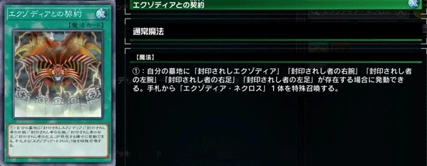 效果:此卡无法进行通常召唤,仅能通过「与艾克佐迪亚的契约」的效果实现特殊召唤。其一:此卡不会因战斗以及魔法、陷阱卡的效果而遭到破坏。其二:在自身准备阶段发动,此卡攻击力提升500 。其三:若自身墓地中不存在「被封印的艾克佐迪亚」「被封印者的右腕」「被封印者的左腕」「被封印者的右足」「被封印者的左足」中的任意一种,此卡将被破坏。