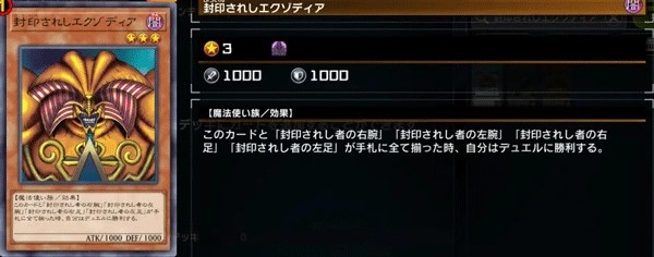 效果:这张卡和「被封印者的右腕」「被封印者的左腕」「被封印者的右足」「被封印者的左足」在手卡全部齐集时,自己决斗胜利。