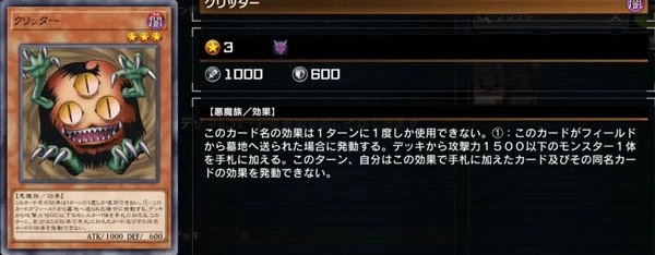 效果:此卡名的效果一回合仅能使用一次。①:当这张卡从场上被送去墓地时发动。从卡组中选取1只攻击力1500以下的怪兽加入手牌。在本回合内,自身无法发动通过此效果加入手牌的卡片以及那些与之同名的卡片。
