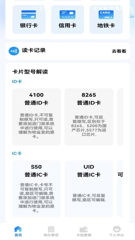 NFC万能管家是一款集卡片管理与待办事项管理于一体的多功能软件,具备强大的读卡能力,用户在应用内可轻松读取银行卡、信用卡、公交卡等各类卡片,满足日常出行与消费需求,无需随身携带实体卡片,通过手机即可直接刷卡,让消费购物与乘车出行更加便捷高效;同时,软件还提供贴心的待办事项管理服务,采用四象限记录方式,帮助用户高效添加和保存任务,合理安排时间处理事务,助力提升个人效率;作为简单易用的实用工具,有需要的用户欢迎体验NFC万能管家手机版。