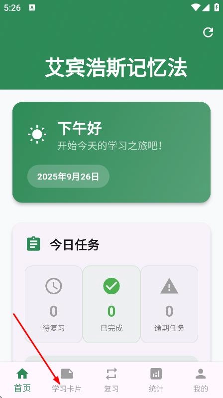2、在艾宾浩斯记忆法主页面,点击学习卡片,进入学习卡片页面。