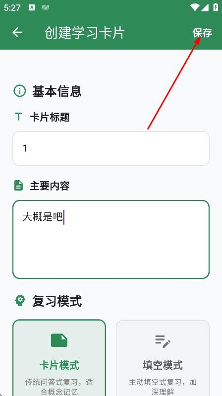 4、在创建学习中填写卡片信息后,点击保存,完成学习卡片创建。