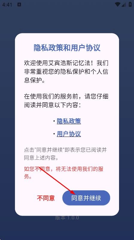 1、在弹出的隐私政策与用户协议窗口中,点击“同意并继续”按钮,即可进入主页面。