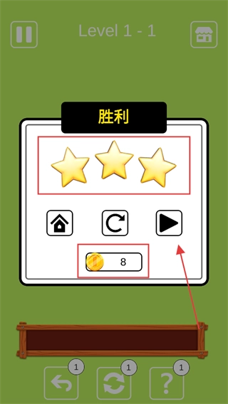 4、成功通关后,可收获【三颗星】评价以及【8】枚金币的奖励。点击向右箭头,就能继续挑战下一关,助力提升游戏成就。