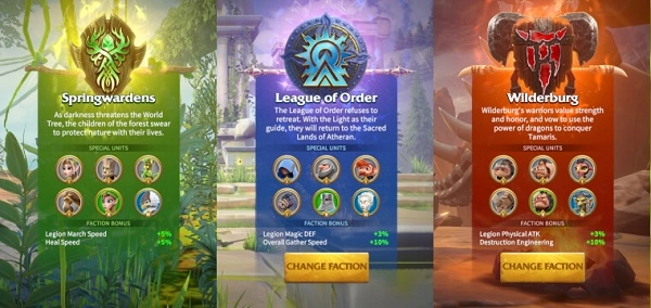 您需先从3个可选派系里挑选其一,分别为秩序联盟(人类)、Springwardens(精灵)以及Wilderburg(兽人)。每个派系皆具备自身独特的单位、建筑设计、能力,还有专属的英雄。接下来,您能够建造自己的城市,采集资源,训练并部署单位以与其他玩家展开战斗,同时也能够缔结联盟。