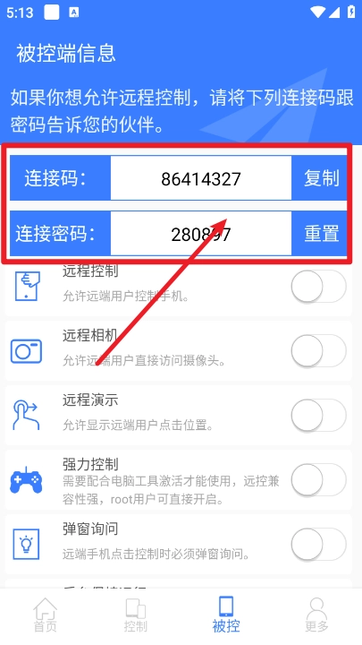 3、受控功能是当你需要别人帮助时,你可以给别人被控制的连接码,他们就可以连接到你的手机;